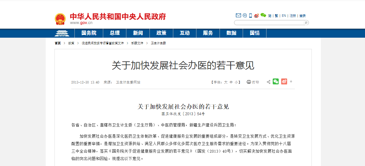 2013年12月30日,國家衛生計生委與國家中醫藥管理局共同發布《關于加快發展社會辦醫的若干意見》(以下簡稱《意見》)。該《意見》強調,加快發展社會辦醫智慧醫療是增加衛生資源供給、滿足人民群眾多樣化多層次醫療衛生服務需求的重要途徑。
