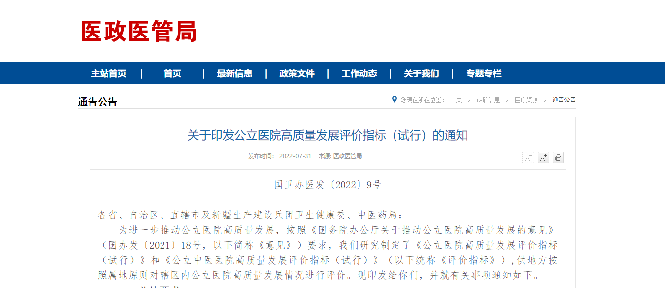 近日,國家衛生健康委、國家中醫藥管理局聯合印發了《公立醫院高質量發展評價指標(試行)》和《公立中醫醫院高質量發展評價指標(試行)》。圍繞黨建引領、能力提升、結構優化、創新增效、文化聚力等五大方面,制定了具體定性、定量項目,供各地對轄區內公立醫院高質量發展情況進行評價。