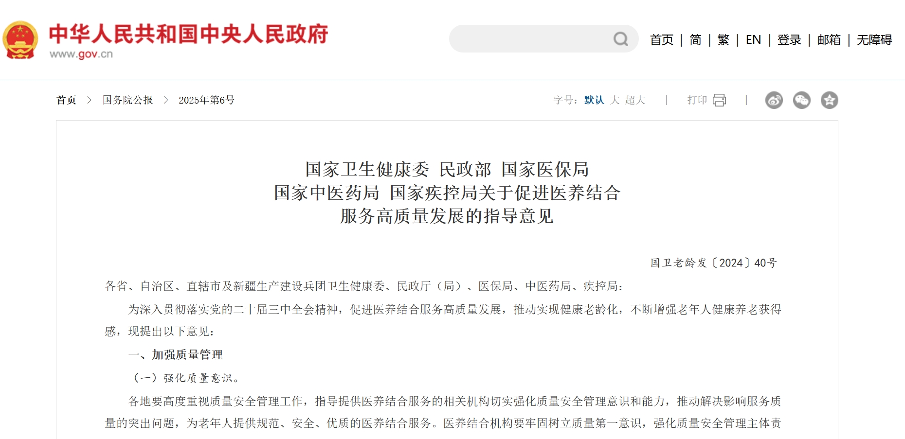 隨著我國(guó)老齡化進(jìn)程的加速,如何讓老年人安享幸福晚年,成為全社會(huì)關(guān)注的焦點(diǎn)。在此背景下,國(guó)家衛(wèi)生健康委、民政部、國(guó)家醫(yī)保局、國(guó)家中醫(yī)藥局、國(guó)家疾控局聯(lián)合印發(fā)的《關(guān)于促進(jìn)醫(yī)養(yǎng)結(jié)合服務(wù)高質(zhì)量發(fā)展的指導(dǎo)意見》,猶如一場(chǎng)及時(shí)雨,為推動(dòng)醫(yī)養(yǎng)結(jié)合服務(wù)的高質(zhì)量發(fā)展,實(shí)現(xiàn)健康老齡化,提供了有力的政策支撐。