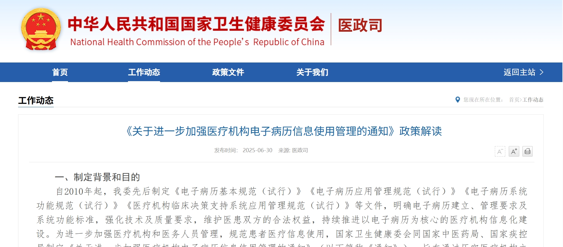 在醫(yī)療信息化高速發(fā)展的今天,電子病歷早已成為醫(yī)療機(jī)構(gòu)日常診療工作的重要組成部分。然而,隨著數(shù)據(jù)泄露事件頻發(fā),電子病歷的安全管理迫在眉睫。6月30日,國(guó)家衛(wèi)生健康委、國(guó)家中醫(yī)藥局、國(guó)家疾控局三部門聯(lián)合發(fā)布《關(guān)于進(jìn)一步加強(qiáng)醫(yī)療機(jī)構(gòu)子病歷信息使用管理的通知》(以下簡(jiǎn)稱《通知》),對(duì)電子病歷的規(guī)范管理、權(quán)限控制、數(shù)據(jù)安全等提出更嚴(yán)格要求。這是繼2017年《電子病歷應(yīng)用管理規(guī)范(行)》后,我國(guó)醫(yī)療信息化領(lǐng)域的又一里程碑式政策。以下是新規(guī)的六大核心要點(diǎn),醫(yī)療機(jī)構(gòu)和醫(yī)務(wù)人員必看!