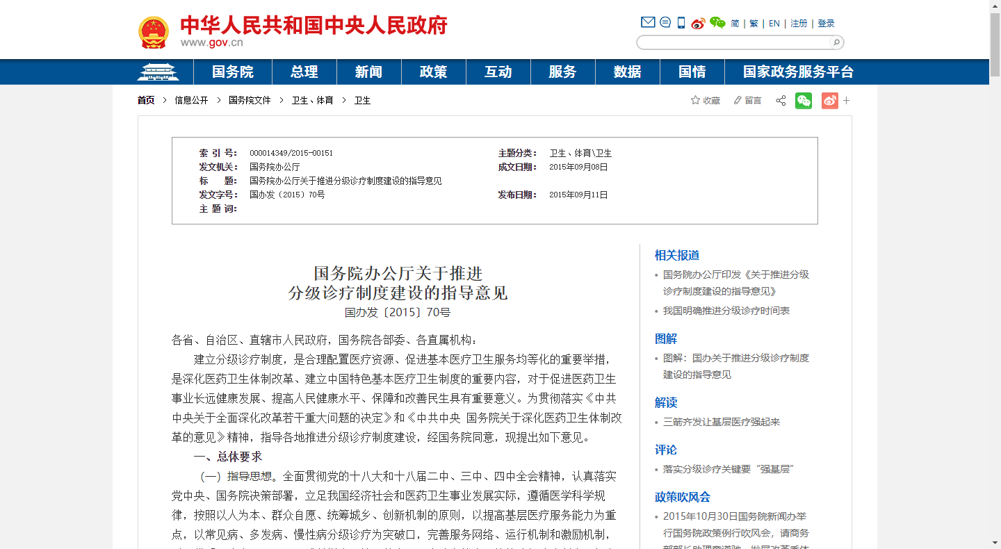 建立分級診療制度,是合理配置醫療資源、促進基本醫療衛生服務均等化的重要舉措,是深化醫藥衛生體制改革、建立中國特色基本醫療衛生制度的重要內容,對于促進醫藥衛生事業長遠健康發展、提高人民健康水平、保障和改善民生具有重要意義。