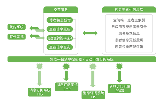眾所周知,臨床醫療活動都是以患者為主線的,各個醫院信息系統都有患者的基本信息,但如果數據標準、維護方式不統一,是無法實現電子病歷等數據整合的。所以,必須要建立全院級統一的患者主索引,從各種不同的子系統中獲取患者的信息進行組織串連起所有病人相關信息,包括基本信息、過敏信息、家族病史、歷次診療信息、檢查檢驗信息、病人主管醫生、歷次電子病例、收費信息、醫囑信息等,根據業務情況個性化設定患者的權重匹配邏輯,明確患者的唯一性,并以此為基礎實現電子病歷、醫院業務、醫院數據、管理數據層面的整合,通過康博嘉IIP對外提供標準交互服務,在患者主索引信息新增、變更時自動推送到訂閱系統。