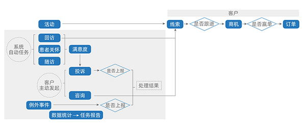 客戶能否心甘情愿復購、主動向身邊人推薦,同樣取決于醫療機構關懷回訪到不到位。康博嘉醫院CRM可以實現服務任務自動化,根據實際進展判斷客戶出院幾天、目前處于哪個階段等,及時創建客戶回訪任務,發送回訪提醒,客服或銷售可根據創建的自定義表單有針對性的噓寒問暖,利于二次推薦,如購買其他醫療產品可提供減免優惠券等。