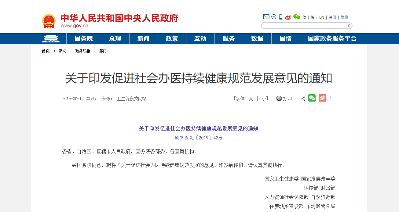 關于印發促進社會辦醫持續健康規范發展意見的通知