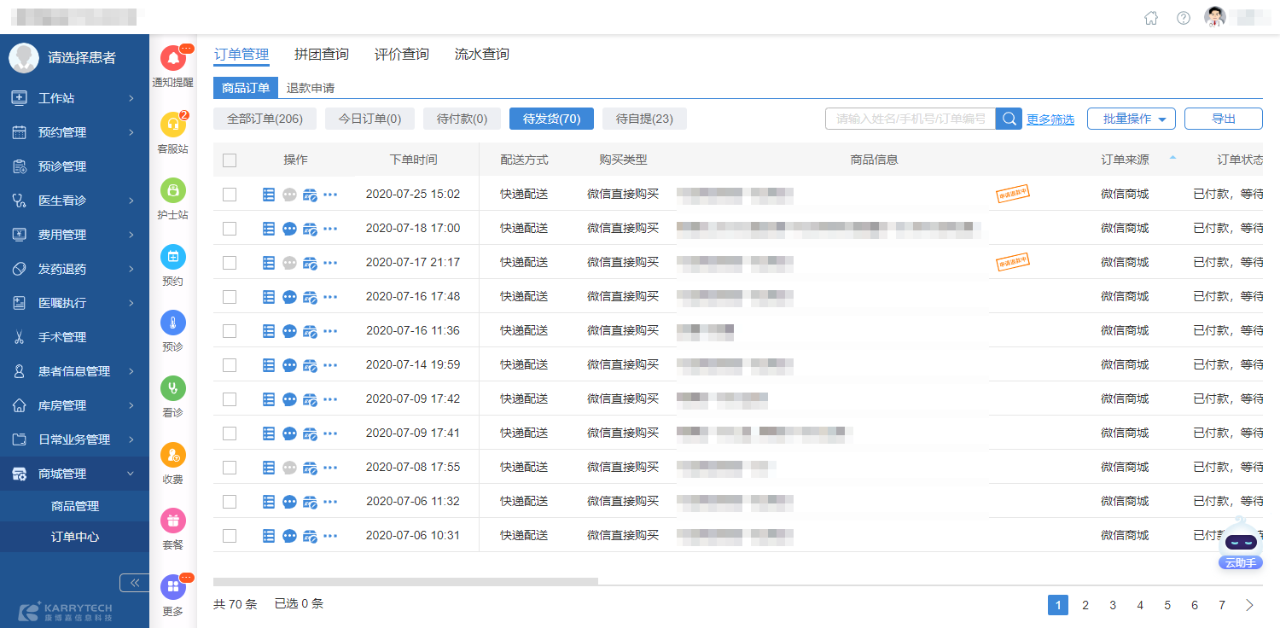 第三步,處理訂單。對于需要客戶到店履約的訂單,可以在醫療軟件中的【訂單管理】查詢到客戶信息,客服可提前跟客戶聯系,確定履約時間,做好預約等相關準備工作。對于需要郵寄的訂單,可以在【商品訂單】中查詢到相關信息。